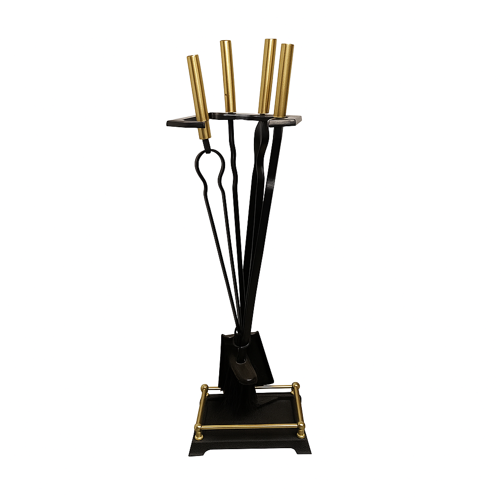 Κομψό και πρακτικό σετ εργαλείων τζακιού που οργανώνει όλα όσα χρειάζεστε για ανάμα και καθάρισμα. Η βαριά τετράγωνη βάση προσφέρει άριστη σταθερότητα, ενώ οι χρυσές λεπτομέρειες στις λαβές και στη βάση δίνουν διακριτική, πολυτελή εμφάνιση που ταιριάζει τόσο σε κλασικούς όσο και σε μοντέρνους χώρους.