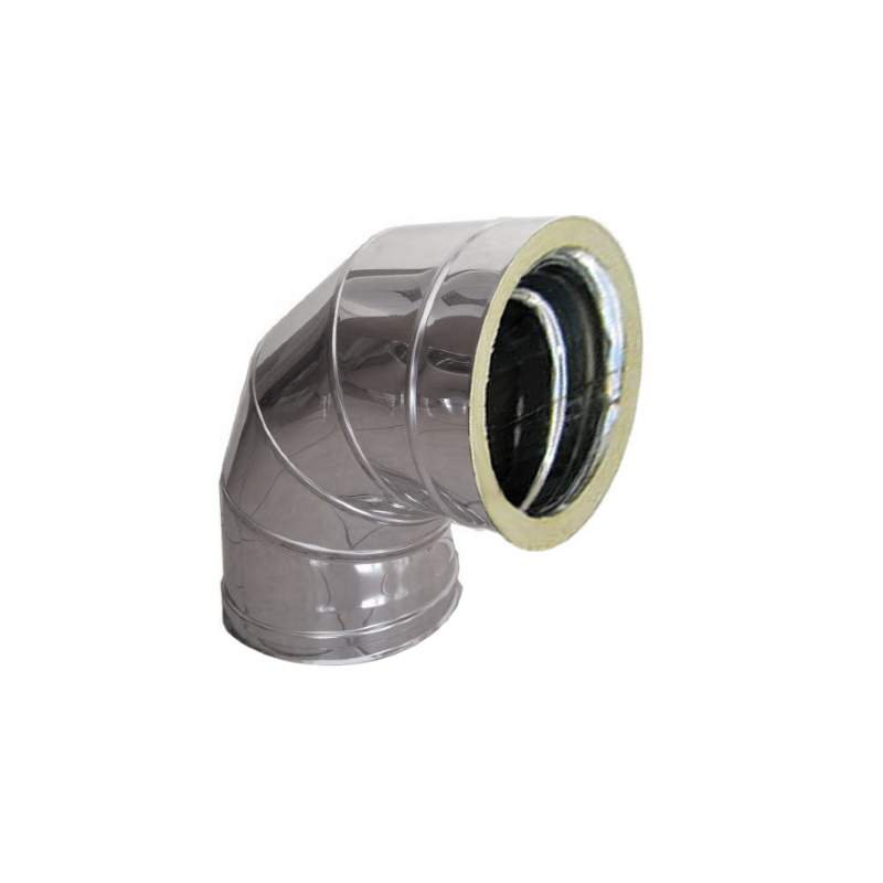 Γωνία διπλού τοιχώματος 90°, με ενσωματωμένη μόνωση για ασφαλή αλλαγή κατεύθυνσης και ελάχιστες απώλειες ελκυσμού. Κατάλληλο για σόμπες/τζάκια ξύλου & πέλετ, λέβητες πετρελαίου/αερίου και βιομάζας, σε εσωτερική ή εξωτερική εγκατάσταση.